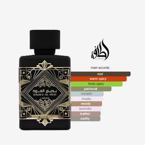 A timeless oriental woody fragrance built around luxurious oud. It opens with saffron, nutmeg, and lavender, leading into a deep heart of oud and patchouli. The base amplifies the woody richness with more oud, musk, and earthy patchouli for exceptional longevity.
