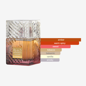 Khamrah Dukhan is a smoky oriental fragrance crafted for men, offering a deep and intense scent profile. It begins with spicy notes and mandarin, leading into a warm heart of incense, labdanum, orange blossom, and patchouli. The base is rich and sweet with praline, tobacco, amber, and tonka bean, creating a powerful, long-lasting finish.