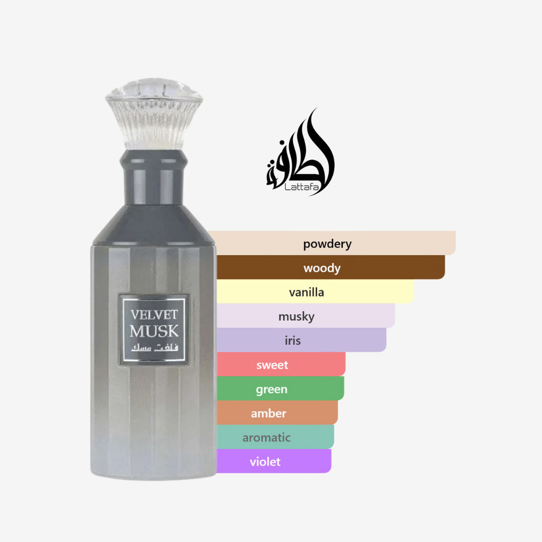 Velvet Musk by Lattafa, launched in 2024, is a woody aromatic fragrance built around clean musk and soft woods. Elegant and versatile, it is ideal for daily wear with a smooth, comforting trail.