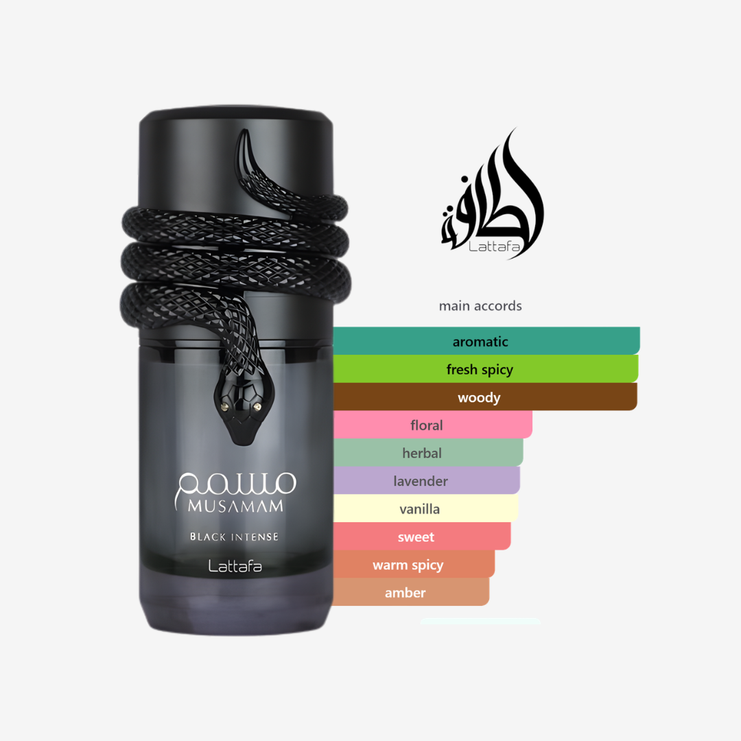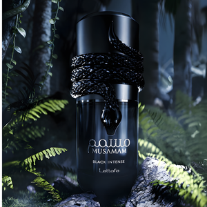 Musamam Black Intense is a woody aromatic fragrance for women and men, created by Jordi Fernández. A bold blend of aromatic freshness, floral depth, and warm gourmand woods with strong projection and longevity.