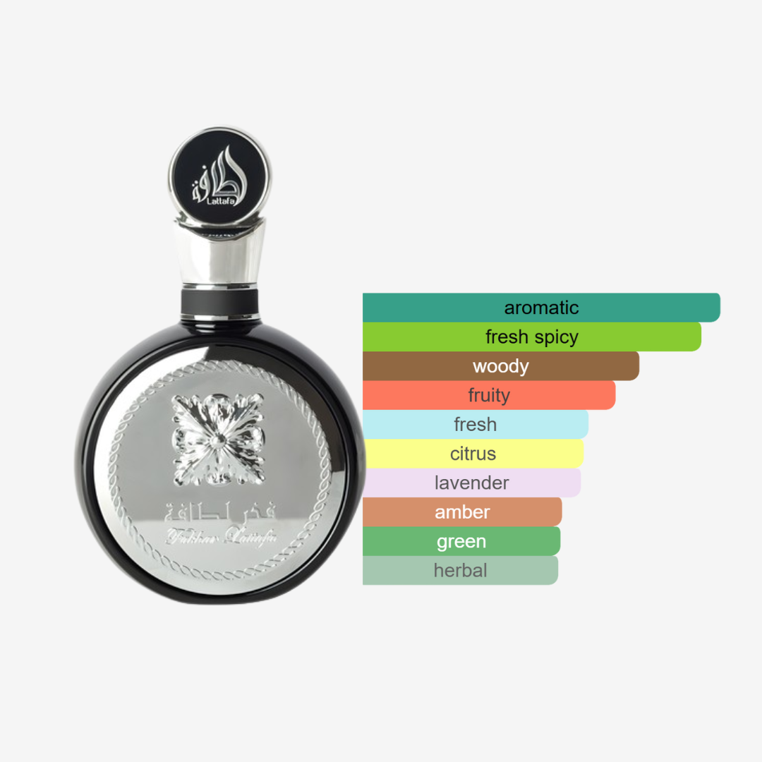 Fakhar Black by Lattafa is a masculine oriental fragrance that blends freshness, spice, and deep woodiness. The scent opens with apple, bergamot, and ginger for a crisp start. Lavender, sage, geranium, and juniper berries add aromatic depth, while tonka bean, cedar, amberwood, and vetiver create a warm, long-lasting base.