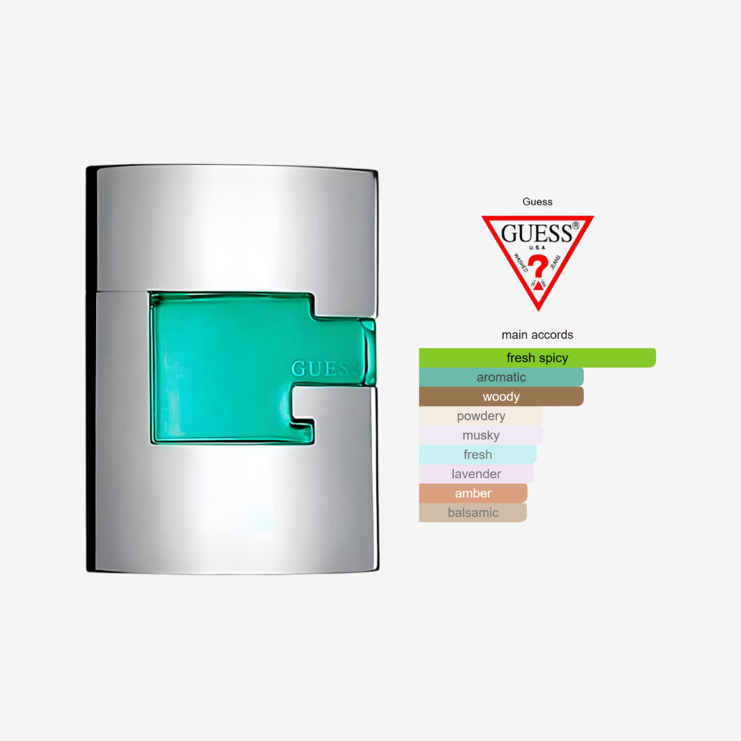 Guess Man by Guess is a fresh citrus aromatic fragrance for men, launched in 2006. It opens with aromatic wormwood, develops into a spicy heart of lavender, ginger, and nutmeg, and finishes with a warm woody base.