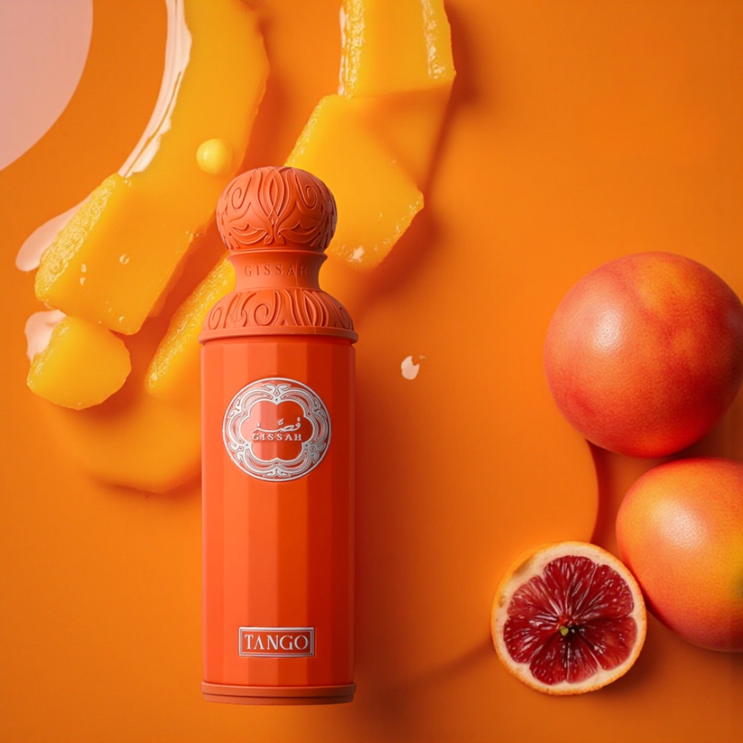 Tango by Gissah is a feminine Fruity Woody Gourmand fragrance that blends tropical sweetness with warm sensuality. It opens with a juicy burst of mango, orange, and pomelo, offering a bright and uplifting start. The heart brings a creamy mix of caramel, jasmine, and vanilla, creating a delicious and addictive warmth. In the base, sage, amber, and cedarwood add depth and elegance, completing a long-lasting and modern scent perfect for confident women.
